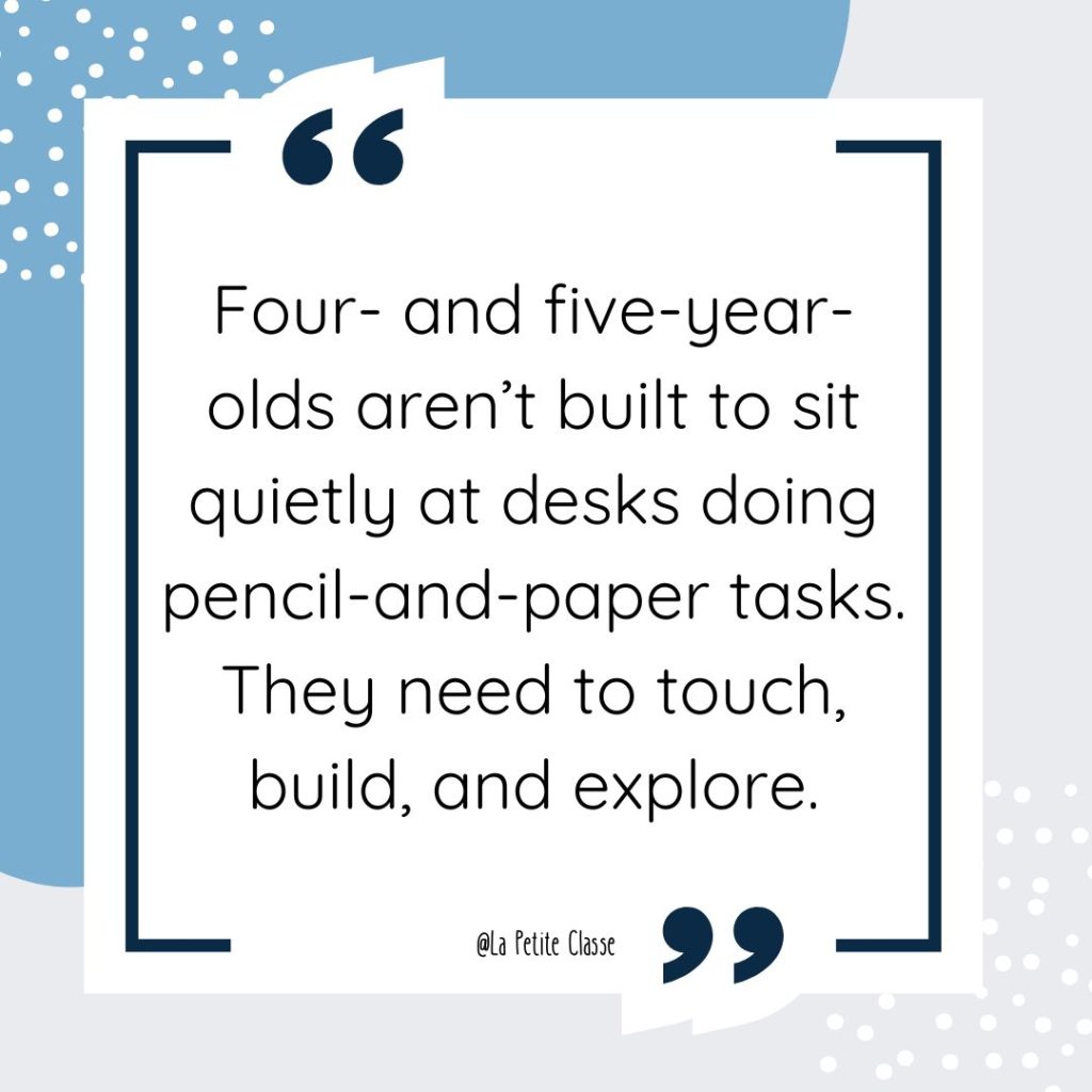I told them this: don’t get hung up on the word play. Think of it as hands-on exploration. Four- and five-year-olds aren’t built to sit quietly at desks doing pencil-and-paper tasks. They need to touch, build, and explore.